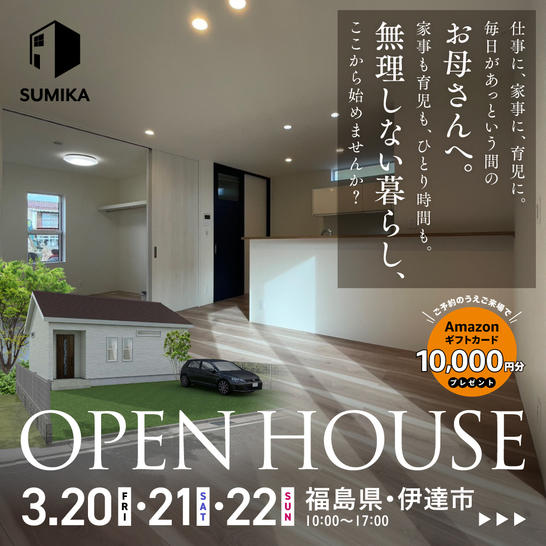 【OPEN HOUSE】仕事に、家事に、育児に。 毎日があっという間のお母さんへ。 ワンフロアで家事ラクな コンパクト平屋。 無理しない暮らしを体感しませんか?★福島県伊達市★